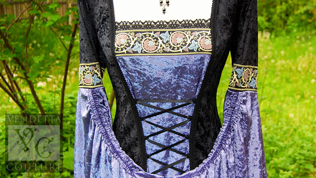 This dress is made in a black and lavender (pale purplish blue) crushed (panne) velvet and complemented with a jacquard ribbon trim.