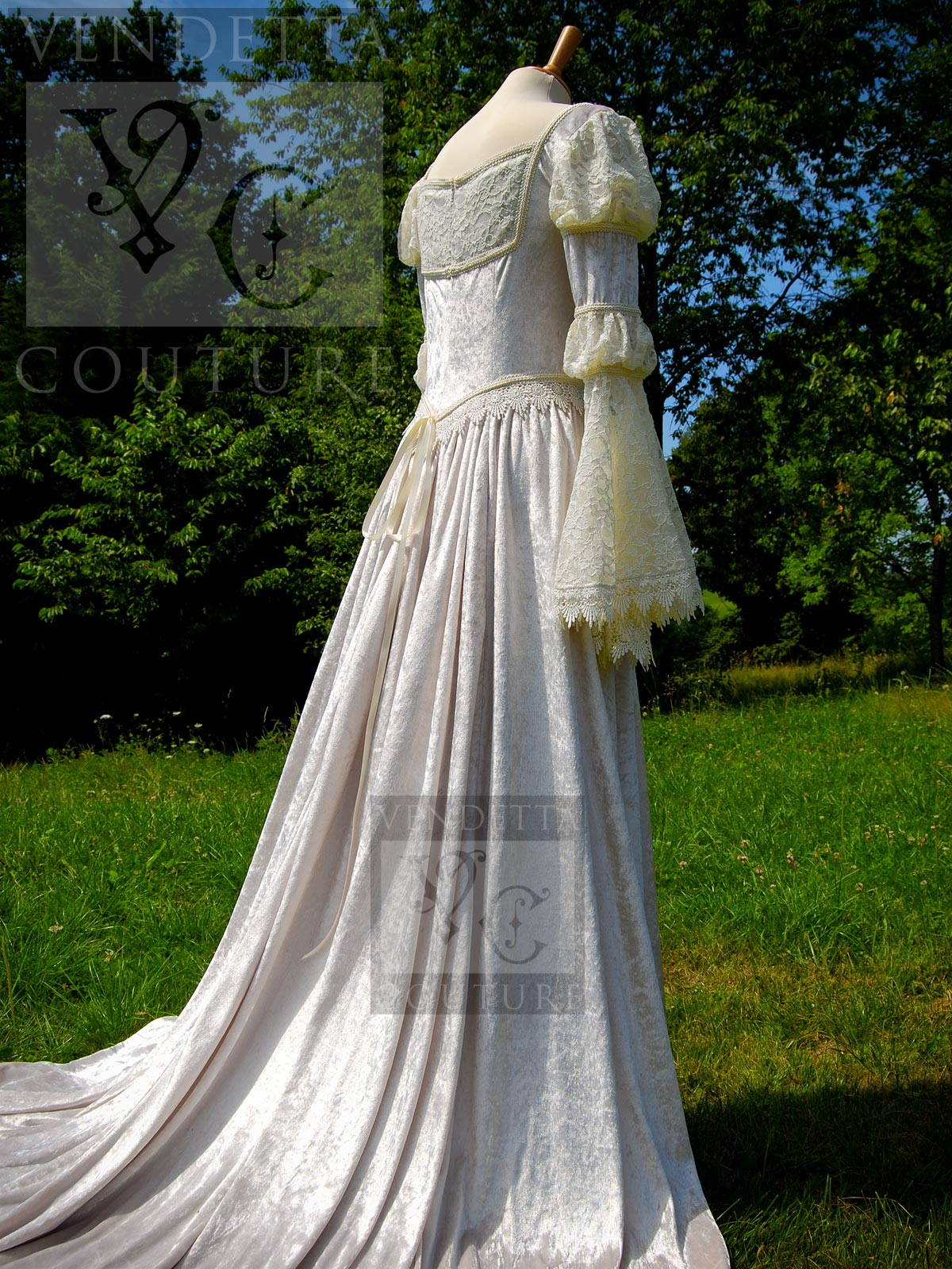 It is made in a champagne (dark ivory) crushed (panne) velvet and complemented with ivory corded lace.