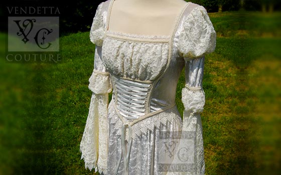 Below the bust there is decorative corset style lacing with satin ribbons. The back of the bodice follows the front in shaping but with a smooth layer of lace across the back rather than gathered like the front.