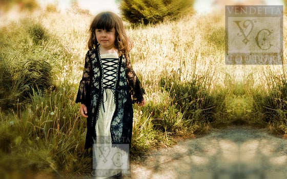 The dress (actually it is long jacket) is made in a pretty black corded lace. It has a fitted bodice and shaped waistline.