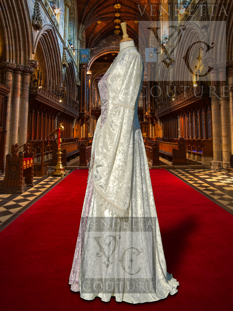 This beautiful fairytale wedding gown is made in a rich ivory and pale pink crushed velvet and complemented with braid and guipure lace. The velvet is beautiful and silky to touch.