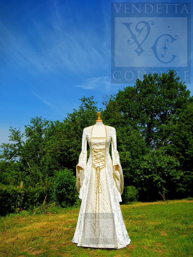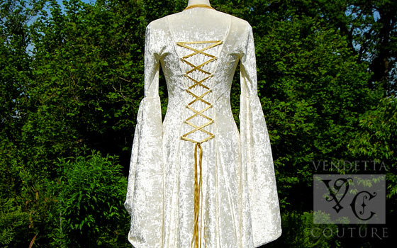 This beautiful medieval inspired gown is made in a rich and luscious ivory crushed velvet and complemented with ivory embroidered dupion.