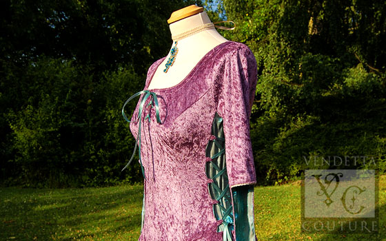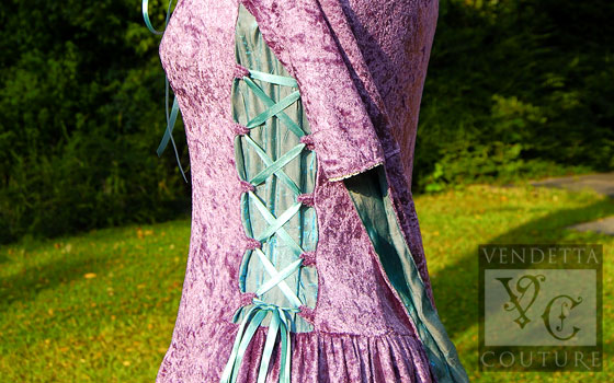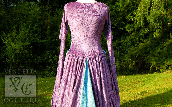Pretty medieval inspired gown made in a rosy lilac coloured crushed (panne) velvet and complemented with aqua (light turquoise) two tone crinkle shimmer fabric. The shimmer fabric shades with movement from aqua to a pale mocha colour.