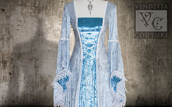 The gown is made in silvery grey and matched with aqua (pale turquoise) crushed (panne) velvet.
